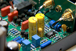 Obudowę przedwzmacniacza R20 wykonano z bardzo grubej blachy, zaś front z aluminium. Ponieważ między głównym chassis i frontem mamy przewężenie ze stalowej blachy nierdzewnej, daje to bardzo dobry efekt plastyczny. Przedwzmacniacz jest zaskakująco ciężki, na co składa się obudowa, ale także transformator toroidalny, zaekranowany grubą blachą. Układ zmontowano na jednaj płytce drukowanej, z drugą, pomocniczą, do której przykręcono złocone gniazda wejściowe i wyjściowe oraz selektor impedancji. Układ wygląda niezwykle solidnie. Zasilanie przygotowano osobno dla każdego kanału, z kondensatorami Nichicona. Korekcja RIAA oparta jest o niskoszumne tranzystory oraz scalak Burr-Browna OPA2134 (wyjście). Bardzo dobre są elementy pasywne, ponieważ oporniki mają tolerancję 1%, są metalizowane, zaś kondensatory, to mieszanka foliowych BC, polipropylenowych WIMA i ERO i tantalowych. Płytka ma z boku ekran, za którym poprowadzono kable zasilające, na które nałożono rdzeń ferrytowy.