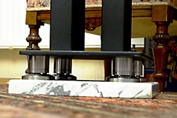 Wszystkie podstawki Cera to produkt niemieckiej firmy Finite Elemente, znanej przede wszystkim z fenomenalnych, będących obiektem moich westchnień i cichym marzeniem, podstawek pod sprzęt (chodzi o mebel) Pagode. Ich sukces zasadza się przede wszystkim na dbałości o szczegóły, takie jak np. izolatory. Wszystkie podstawki Cera zbudowane są wokół tego samego konceptu: mamy bazę, czyli spód, w którym wyfrezowane jest łoże pod wykonaną ze spieków ceramicznych kulkę. Główny element ma wokół obwodu naciągnięty gumowy ring. Na to nachodzi drugi, szerszy element, w którym od spodu także podfrezowany jest otwór, na którym spoczywa kulka. Całość trzyma się razem, bez przesunięć, dzięki wspomnianemu ringowi, zaś miejscem styku i interfejsem między podłożem i urządzeniem jest wspomniana ceramiczna kulka. W największej podstawce, właściwie „stopie” CeraBase mamy trzy takie kulki, zaś całość trzyma się dzięki umieszczonemu centralnie trzpieniowi z gumowym ringiem. Proste i efektywne, ponieważ nie trzeba się martwić o podstawkę – w Cera mamy zintegrowaną podstawkę i izolator. Nordost to także „sztywny” izolator, złożony jednak z dwóch elementów – dużej części głównej, z ostrym szpikulcem oraz podstawki. Dostępne są dwa rodzaje Pulsar Pointów – aluminiowy oraz tytanowy – testowaliśmy ten ostatni. I wreszcie Vibrapody. To „miękkie” podkładki z dwóch elementów – gumowego, szerokiego krążka z fałdą oraz gumowego stożka z umieszczoną na końcu kulką stalową. Stożek opiera się na wspomnianej fałdzie. Ponieważ na początku nieco się rozgadałem, więc przejdę do meritum: absolutnie bezkonkurencyjne, naszym zdaniem, okazały się podstawki CeraPuc, które zaraz potem zakupiłem i na które nastawiają się pozostali uczestnicy odsłuchu. Dźwięk z nimi szlachetniał, stawał się bardziej skupiony. Co ciekawe, a potwierdziłem to po podłożeniu pod moim Lektorem, mocniej gra z nimi bas – jest zwarty i konturowy i generalnie bardziej obecny. Dźwięk nabierał głębi i dynamiki. W systemach, gdzie jest problem z atakiem dźwięku, tj. tam, gdzie jest nieco utwardzony, CeraPuc podkreśli tę przypadłość. Jeśli mamy nie do końca kontrolowany bas, to wprawdzie podkładki nieco go zdyscyplinują, jednak uwypuklą też jego wady. W podobnym kierunku idą mniejsze podkładki CeraBall, z tym, że zmiany nie były aż tak dramatyczne. To ten sam kierunek, może nawet w mocniejszym stopniu dyscyplinujący dźwięk, jednak bez owej gładkości i naturalności, jaką otwierały CeraPuki. CeraBase wypróbowany był po podstawkami, na których stały Electy Sonus Fabera (opis TUTAJ). Efekt był podobny jak przy CeraPukach – poprawa dźwięczności, skupienia, bez wyostrzania, a nawet z lekkim wygładzeniem góry. Wypróbowaliśmy dwa ustawienia – pod podstawkami kolumn/na podstawkach marmurowych i pod podstawkami marmurowymi/na podłodze. Ta ostatnia kombinacja była fatalna, po prostu fatalna. Jednak pod podstawkami – super. Ciekawie brzmiały Nordosty. To, jak się wydaje, znacznie lepszy izolator niż standardowe Monacory, ponieważ „czyści” wszystko z wewnętrznych napięć. A jednak CeraPuc był wciąż znacznie lepszy, doprowadzając do końca to, co Pointy sugerowały. I wreszcie Vibrapody – okazało się, że za niewielkie pieniądze otrzymujemy znaczącą poprawę w dźwięku. Charakter zmian był nieco inny niż przy „twardych” izolatorach – np. nie było tak dobrego skupienia źródeł pozornych. A jednak dynamika w porównaniu z Monacorem była znacznie lepsza, a w dźwięku było więcej „życia”.