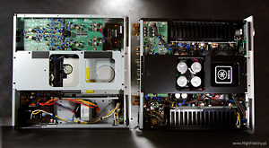 Budowa mechaniczna wzmacniacza jest równie imponująca, co wzmacniacza. Na płycie przedniej umieszczono gałkę siły głosu oraz selektora wejść. Do dyspozycji mamy trzy wejścia liniowe, jedno gramofonowe MM/MC oraz wejście ‘main’ in’, wybierane z tym samym pokrętłem, którym wchodzimy bezpośrednio na końcówkę mocy, Wykorzystamy je zapewne przede wszystkim w systemach kina domowego, integrując z nimi nasze stereo. Obok mamy trzy podłużne manipulatory z potencjometrami – balansu oraz barwy dźwięku. Jest też przełącznik mute, przy którym gałka siły głosu wraca do położenia min., a także mały przełącznik, którym wybieramy miedzy podwójnymi zaciskami na tylnej ściance. Te można też wyłączyć, aby skorzystać z wyjścia słuchawkowego. Z tyłu mamy wspomniane zaciski głośnikowe – solidne, złocone, choć bez fajerwerków. Wejście CD jest nieco lepsze niż pozostałe,. Jest tu też wyjście z przedwzmacniacza oraz gniazdo sieciowe IEC, które – podobnie jak w SACD – jest złocone. Wewnątrz urządzenie jest niemal identyczne, jak A-S2000: pośrodku zasilacz z bardzo ładnym, ekranowanym transformatorem i zasilaczami. Te ostatnie korzystają z osobnych uzwojeń wtórnych dla każdego kanału, a w ich ramach dla sekcji napięciowej – tutaj kondensatory Nichicona Fine Tune – prądowej końcówki z dużymi kondensatorami Yamahy. Te ostatnie są nieco mniejsze niż wcześniej – zamiast 4 x 22000 μF mamy 4 x 18000 μF. Kondensatory tłumione są mechanicznie mikrogumą. Przy tylnej ściance mamy sekcję przedwzmacniacza. Zastosowano w niej nietypowy zabieg, a mianowicie przygotowano właściwie trzy przedwzmacniacze – dla regulacji poziomu głosu bez regulacji barwy dźwięku, dla poziomu głosu z regulacją basu oraz poziomu głosu z regulacją sopranów. Pozwala to uniezależnić system od każdego z tych układów. Układy te wykonano na dużych scalakach Toshiby. Umieszczony przy przedniej ściance potencjometr Alpsa najwyraźniej steruje wspomnianymi układami napięciowo, nie znajdując się w torze sygnału. Końcówki zmontowano na osobnych płytkach przykręconych do dużych radiatorów. Są tu trzy pary tranzystorów końcowych, pracujących – według materiałów formowych – w układzie „zmostkowanego single-ended”. Całość wygląda bardzo porządnie.