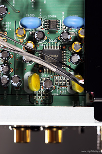 W środku rzucamy okiem najpierw na wspomniany, znakomity napęd. , z metalowymi elementami konstrukcji, odlewaną szufladą itp. Jak podaje firma, do kręcenia dyskiem użyto silnika bezszczotkowego. Po Lewej stronie umieszczono średniej wielkości transformator o tradycyjnej budowie EI z kilkoma uzwojeniami wtórnymi. Zasilacz i spore kondensatory Nichicona z linii Fine Tune umieszczono za napędem. Po jego prawej stronie mamy układ audio. Zarówno tę część, jak i z drugiej strony zasilacz odseparowano od napędu sztywnym ekranem z blachy. Rozpoczyna się, trochę nieoczekiwanie, od dwóch stereofonicznych przetworników PCM1796 – Burr-Browna, po jednym na kanał. Widok to nieoczekiwany, ponieważ układ miał być niezbalansowany. I jest, ale dopiero w sekcji filtrów i wzmocnienia. Aż do końca konwersji I/U jest jednak prowadzony w formie różnicowej. Ponieważ wszystkie płytki są identyczne, jak w S2000, więc widać, że układ wzmacniający zbiera sporo miejsca i jego uproszczenie (przez obcięcie jednej gałęzi) dało wymierne oszczędności. Dodajmy jeszcze, że konwersję I/U oraz układ wzmocnienia wykonano na popularnych, niskoszumnych układach NE5532.