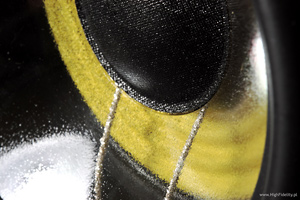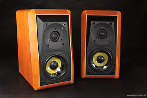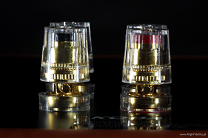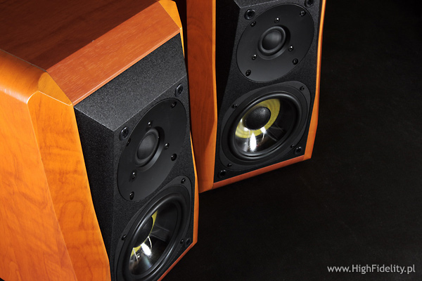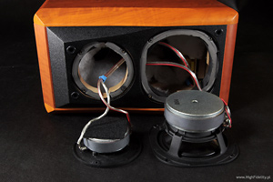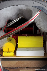 Zwrotnica jest skomplikowana, a zmontowano ją na płytce drukowanej, przykręconej do płyty z MDF-u i do dna obudowy. Znajdziemy w niej cztery cewki (niestety wszystkie rdzeniowe), wiele kondensatorów polipropylenowych i kilka elektrolitycznych. Być może więc poddano linearyzacji impedancję. Głośniki podłączono za pomocą srebrzonych plecionek z miedzi OFC i zalutowano. Zaciski głośnikowe są bardzo ładne, złocone i podwójne, a połączono je – to zupełna rzadkość nawet w drogich konstrukcjach – złoconymi, solidnymi prętami. Zwykle w tym miejscu są blaszki wycięte z konserwy…