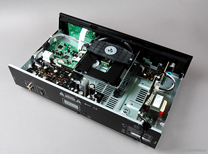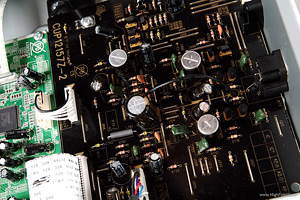 Jak się okazuje, napęd dostarczyła firma Sony. Zamiast znanego wózka optyki KSS-213 zastosowano w nim nowszą, lepszą optykę z serii KPC. Obok niego umieszczono płytkę sterującą, opartą na kościach Toshiby. Tutaj też jest master-clock dla wszystkich układów cyfrowych urządzenia. Przetwornik oraz sekcja analogowa znalazła się na jednej, dużej płytce wraz z zasilaczem. Na początku mamy przetwornik D/A Burr-Browna PCM1791 (niezły układ sigma-delta 24/192), po nim konwersję I/U oraz bufory wyjściowe, wykonane wyłącznie z użyciem tranzystorów. W krytycznych miejscach widać małe kondensatory polipropylenowe, a w zasilaniu bardzo ładne kondensatory elektrolityczne Elna, także z serii Cerafine. Zasilacz oparty jest o niewielki transformator EI, z którego wyprowadzono jednak dwa uzwojenia wtórne – osobne dla części cyfrowej i napędu oraz osobne dla części analogowej. Z boku płytki widać miejsce, gdzie pobierany jest sygnał dla wzmacniacza słuchawkowego. Biegną tam bardzo długie kabelki ekranowane, spięte razem z przewodem zasilającym dla tranzystorów wzmacniających sygnał.