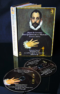 „DON QUIJOTE DE LA MANCHA. ROMANCES Y MUSICAS” ![]() Spis utworów: CD I Première partie I. Je suis la folie Chapitre I : Où l'on apprend les faits et gestes du fameux Don Quichotte de la Manche 1. Fanfarra (instrumental) (Anonyme, CMP 106) 2. Récit : “En un lieu de la Manche...” 3. La Folie : Je suis la folie (Du Bailly) II. Premières aventures Chapitre II : Où l'on traite de la première sortie de l'ingénieux Don Quichotte 4. Cuatro diferencias sobre guardame las vacas (Luys de Narváez) Récit : “Sans faire part à quiconque de ses intentions...” 5. Romance de Moriana : Le maure se souvint avec frayeur... (Anonyme / Luys Milán) 6. Récit : “Il y avait sur le pas de la porte deux filles...” 7. Romance de Lancelot : Jamais ne fut chevalier de dames... (Anonyme / Sefardi) III. Premières mésaventures Chapitres IV-V : Où se poursuit le récit des mésaventures de notre chevalier 8. Pavana II de Alexandre (Alonso Mudarra) Récit : “À la vue d'une troupe de marchands...” 9. Diferencias sobre las Vacas (fragment) (Antonio de Cabezón) Récit : “Un des valets d'écurie...” 10. Romance de Valdovinos : Vous soupirez, Valdovinos (Luys Milán) 11. Récit : “Le brave paysan réussit à grand peine...” 12. Romance de Abindarráez : En campagne part Narvaez... (Anonyme / Diego Pisador) IV. On brûle la bibliothèque Chapitres V-VI : De l'inventaire exhaustif que firent le curé et le barbier de la bibliothèque de notre ingénieux gentilhomme 13. Otras diferencias sobre guárdame las vacas (Luys de Narváez) Récit : “La gouvernante, la nièce, le curé...” 14. Romance de Don Beltrán : Les douze paris et Roncevaux... (Anonyme / Juan Vasquez) 15. Récit : “En prenant plusieurs livres à la fois...” 16. Adoramus te Domine (orgue) (CMM 4) (Anonyme) Prière : “Oh, Très sainte et glorieuse Trinité...” (Tirant lo Blanc - Joanot Martorell) V. Par les foręts et les montagnes Chapitre XI : De ce qui arriva à Don Quichotte avec des gardiens de chèvres 17. Récit : “Don Quichotte et Sancho dînaient...” 18. Antonio : Chanson pour Olalla (Gabriel / Miguel de Cervantes) VI. Où l'on se repose à l'ombre Chapitre XXVII : Comment le curé et le barbier arrivèrent à leurs fins 19. Récit : “Le curé et le barbier étaient en train de se reposer...” 20. Chanson de berger : Qui mésestime mes biens...? (Sant Juan, CMP 68 / Miguel de Cervantes) 21. Récit : “L'heure, la saison, la solitude...” 22. Soneto : Sainte amitié qui d'une aile légère... (Francisco Peńalosa, CMP 311 / Miguel de Cervantes) VII. Une voix chante et enchante Chapitres XLII-XLIII : Où l'on traite de ce qui arriva plus tard dans l'auberge 23. Récit : “Comme la journée avait pour plus de la moitié entamé la nuit...” 24. Chanson : Je suis un marinier d'amour (Anonyme (Sefardí) / Miguel de Cervantes) Seconde partie I. Arrivée au Toboso Chapitre IX : Où l'on raconte ce que l'on va voir 25. Conde Claros (Improvisation) Récit : “Il était minuit tout juste...” 26. Romance du Comte Claros : Il était minuit tout juste... (Francisco Salinas) CD II I. Arrivée au Toboso (Suite) 1. Pavana I (arpa) (Alonso Mudarra) 2. Récit : “Alors que tous deux échangeaient...” 3. Romance de Guarinos : Français, mal vous en prit... (Anonyme, CMP 106) 4. Récit : “J'entends bien, répondit Sancho...” 5. Romance de Calaynos : Calaynos était à cheval... (Anonyme / Enriquez de Valderrábano) II. Où les romances prennent vie Chapitres XXIII-XVI : Des choses admirables des romances dont l'illustre Don Quichotte fut témoin 6. Récit : “Il devait ętre quatre heures de l'après-midi...” 7. Romance : Romance de la plainte de Belerma à la mort de Durandart (Anonyme, CMP 109) 8. Romanesca I (arpa) (Alonso Mudarra) Récit : “Don Quichotte et Sancho assistèrent à un théâtre...” 9. Romance de Don Gaïferos : Si vous ętes en peine... (Anonyme, CMP 113) III. Heurs et malheurs de la duègne affligée Chapitre XXXVIII : Où l'on rapporte le récit que la duègne affligée fit de ses malheurs 10. Récit : “Derrière les tristes musiciens...” 11. Villancico : De ma tendre et douce ennemie (Gabriel / Miguel de Cervantes) 12. Gallarda (Enriquez de Valderrábano) Récit : “Et dans cette męme veine...” 13. Seguidilles en echo (Danse chantée) (Anonyme, CMS 8) IV. Altissidore Chapitre XLIV-XLVI : De l'étrange aventure qui, au château, arriva à Don Quichotte 14. Récit : “Don Quichotte éteignit les chandelles...” 15. Romance d'Altissidore : Oh toi qui es dans ton lit... (Anonyme, CMP 121) 16. Récit : “Quand il fut onze heures du soir, Don Quichotte...” 17. Romance : Généralement les forces d'amour (Antonio de Ribera / Miguel de Cervantes) Récit : “Dehors, maudits enchanteurs...” Chapitre LVII 18. Gallarda (Alonso Mudarra) Récit : “Don Quichotte jugea qu'il était temps...” 19. Lamento de Altisidora : Ecoute, mauvais chevalier... (Anonyme / Miguel de Cervantes) V. À l'entrée de Barcelone Chapitre LXI-LXII : 20. Conde Claros (Instrumental) (Alonso Mudarra) Récit : “Finalement par des chemins de traverse...” 21. Le paysan (Instrumental) (Anonyme / Antonio Martín y Coll) 22. Récit : “La nuit tombait et dans la maison...” 23. Une fęte de la Chaconne (Danse chantée) (Joan Arańés) VI. En Arcadie Chapitre LXVII-LXIX : Où Don Quichotte prit la résolution de devenir berger et de faire sa vie aux champs 24. Récit : “La nuit était plutôt sombre...” 25. Chanson : Amour, lorsque je pense (Venegas de Henestrosa / Miguel de Cervantes) 26. Romance II : Mira nero de Tarpeya (Francisco Palero / Venegas de Henestrosa) Récit : “C'est alors que leur parvint le son...” 27. Chanson : Dès que Altissidore revint à elle... (Francisco Guerrero / Miguel de Cervantes VII. Mourir sain d'esprit et vivre fou Chapitre LXXIV : Comment Don Quichotte tomba malade, comment il fit son testament et sa mort 28. Circumdederum me (orgue) (Cristóbal de Morales